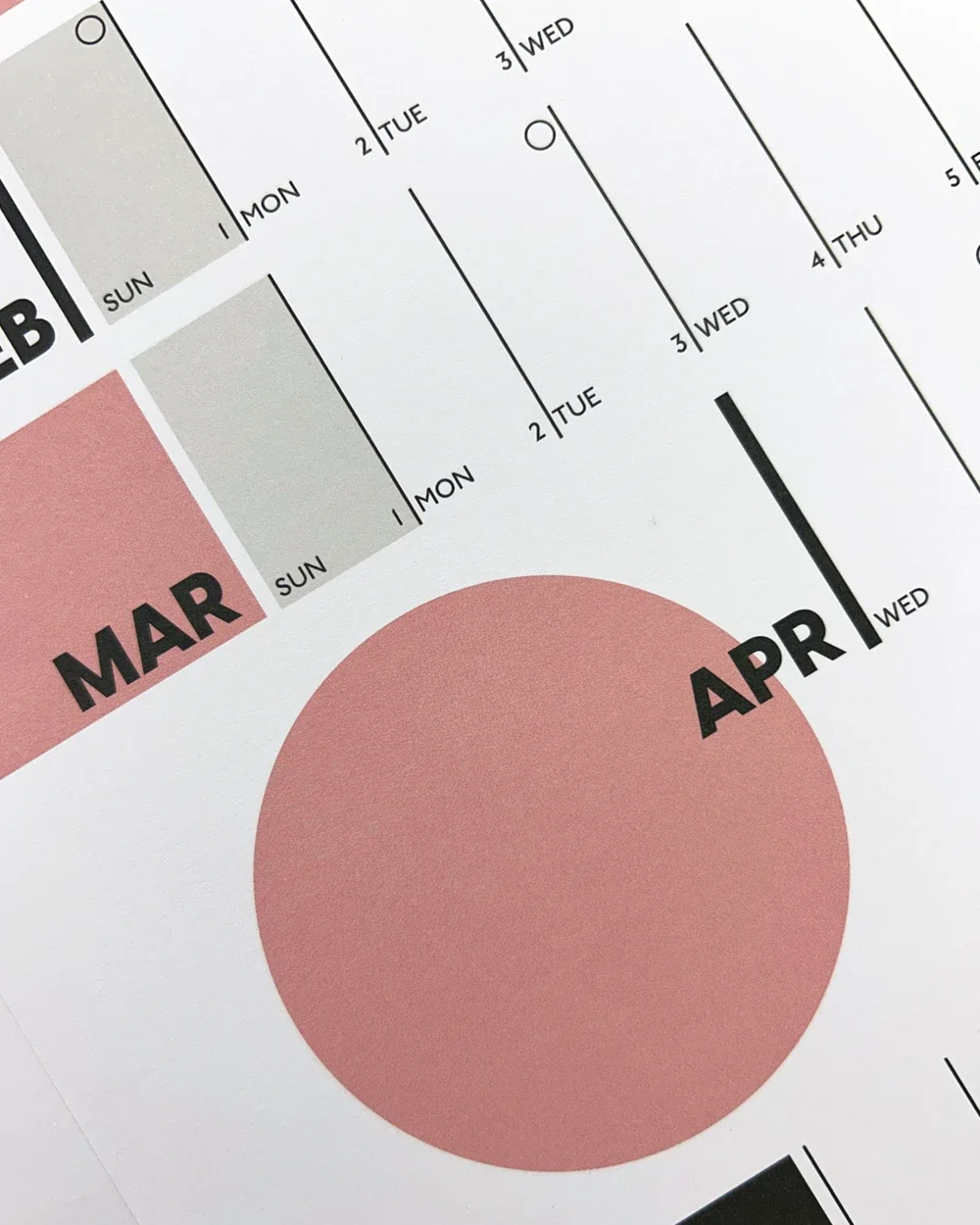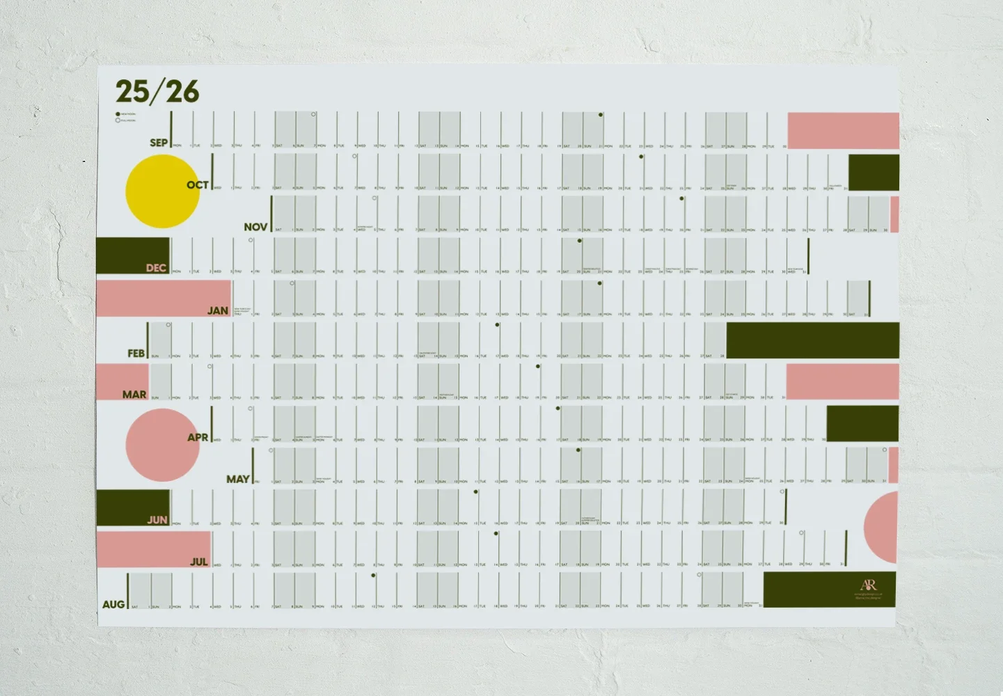Stylish wall planner in pink and rich, dark green with a nod to mid-century design, this contemporary colourful calendar will add life to any blank wall whether in your home or office!